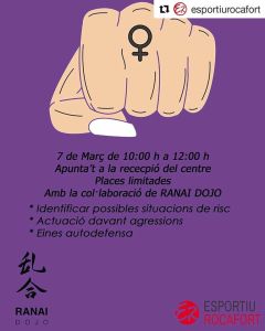 RANAI DOJO ha sido también invitado a colaborar en unos Talleres de Defensa Personal gratuitos junto a Esportiu Rocafortel sábado 7 de marzo de 10:00 a 12:00 en sus instalaciones. Para apuntarte, sólo tienes que llamar (934 26 47 17) o pasar por la recepción del centro (Carrer de Floridablanca, 41).
