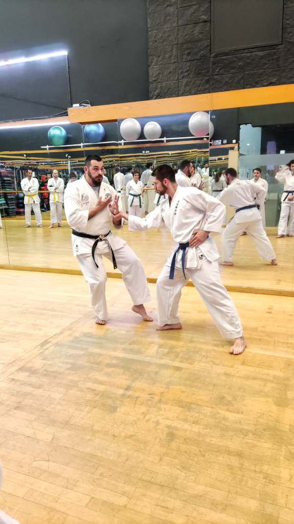 El seminario dividido estratégicamente en 4 bloques, arrancó con sensei Maite, la cúal nos deleitó con el aprendizaje del kata “ Matsukaze “ (específico del estilo Shito Ryu ) y su aplicación a la defensa personal. El segundo bloque, fue dirigido por sensei Didac el cúal os recordó la importancia del uso correcto de la cadera en las técnicas de Karate y se trabajaron ejercicios específicos para una mayor compresión de las explicaciones. El tercero bloque, fue dirigido de forma también majestuosa por sensei Juan, y fue enfocado a las aplicaciones de la defensa personal del kata Heian Sandan. El cuarto y último bloque, corrió a cargo de sensei Didac, en el cúal de forma específica se trabajaron las diferentes formas de kumite.