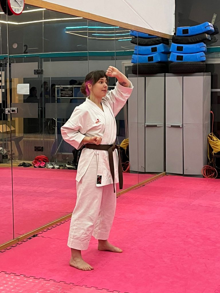 La actividad fue conducida por sempai Marina, quien guió con dedicación, sensibilidad y energía a un grupo de participantes del colectivo FLINTA. Su objetivo: ofrecer un espacio seguro donde descubrir los fundamentos del Karate-Do, conectar con el propio cuerpo y construir confianza a través del movimiento.